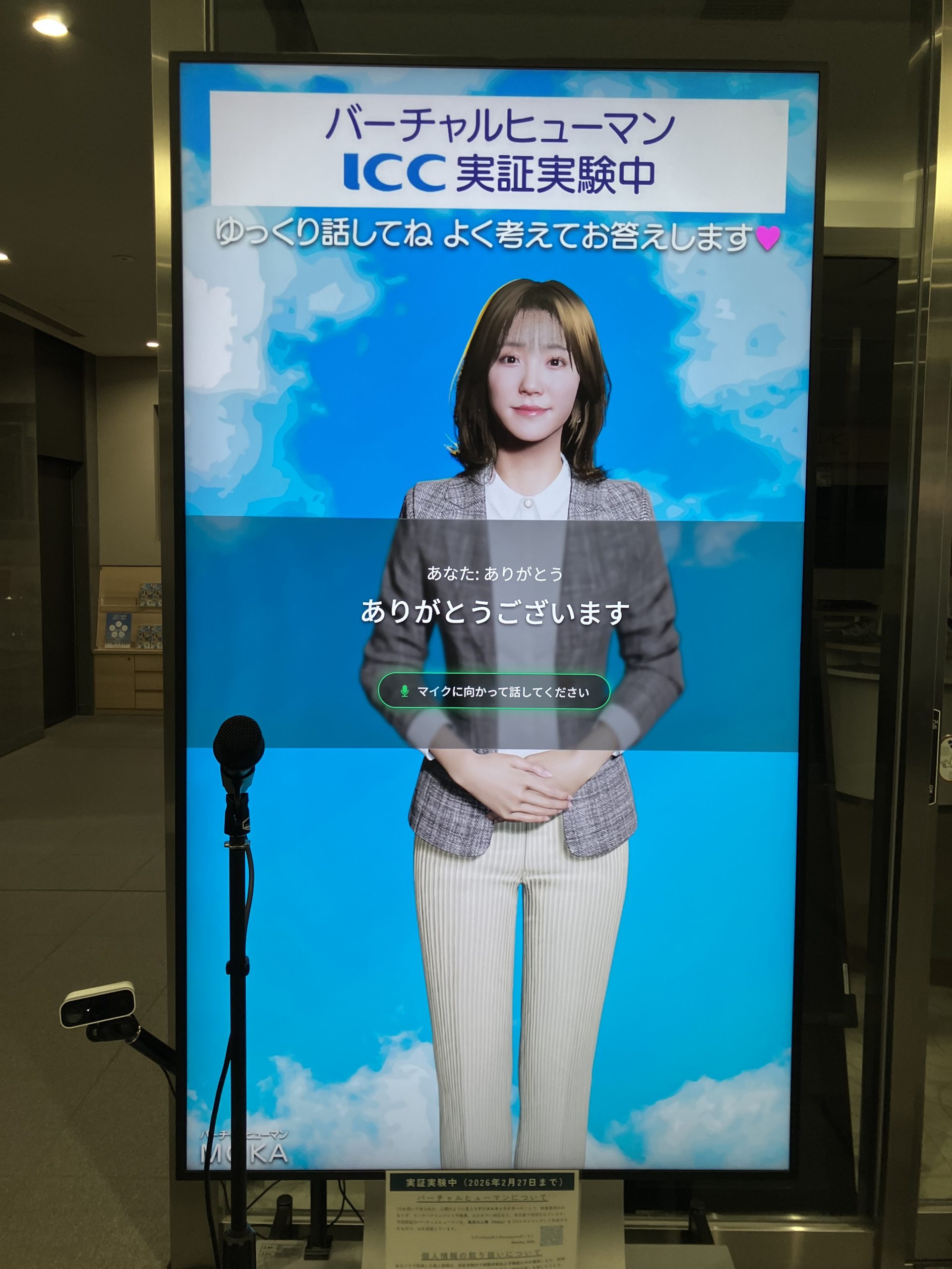 ICCでは、TOPPAN株式会社中部事業部及び一宮商工会議所と、一宮商工会議所ビル全体の受付業務補助をバーチャルヒューマンが行うことで来訪者への利便性向上と受付業務の省力化を目的に、実証実験しております。